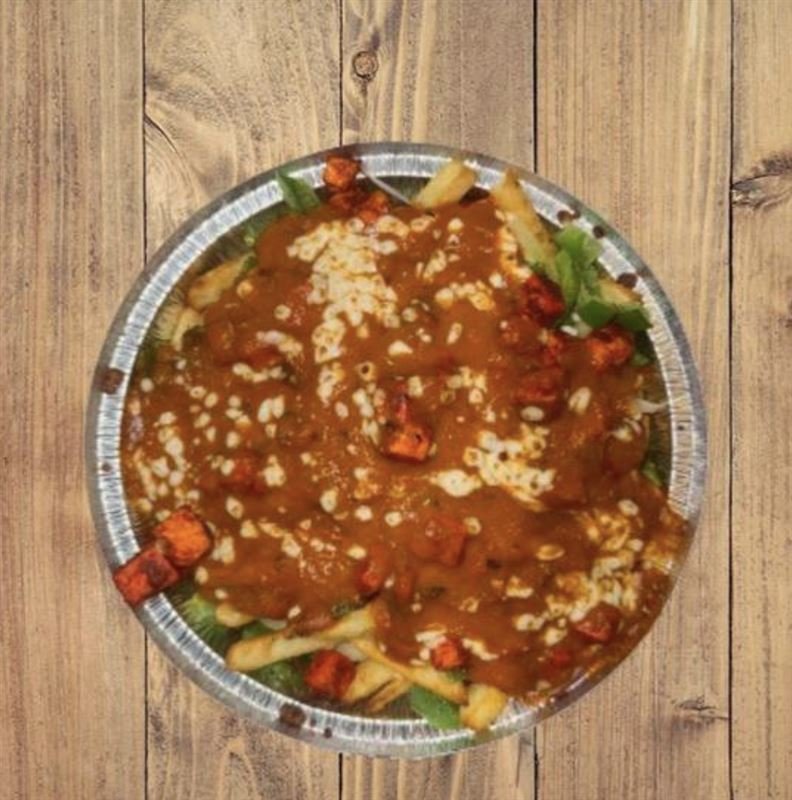 Indian style poutine with cheese, red onions, green pepper, Tandoori Paneer and Indian gravy.