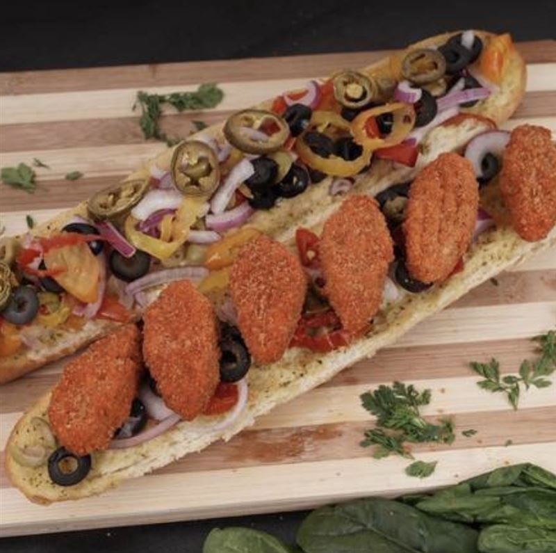 Indian style sub with cheese, red onions, green pepper and black olives.