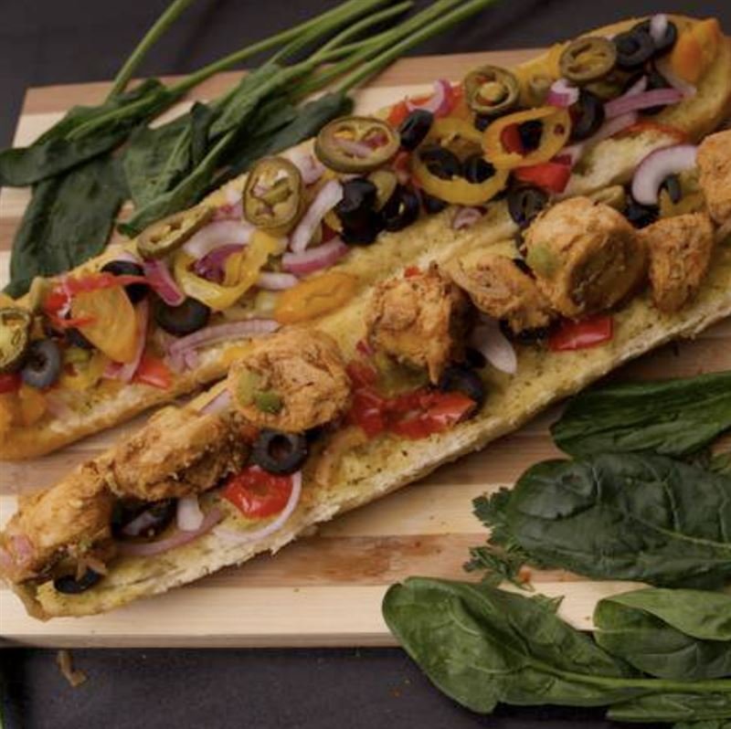 Indian style sub with cheese, red onions, green pepper and black olives.